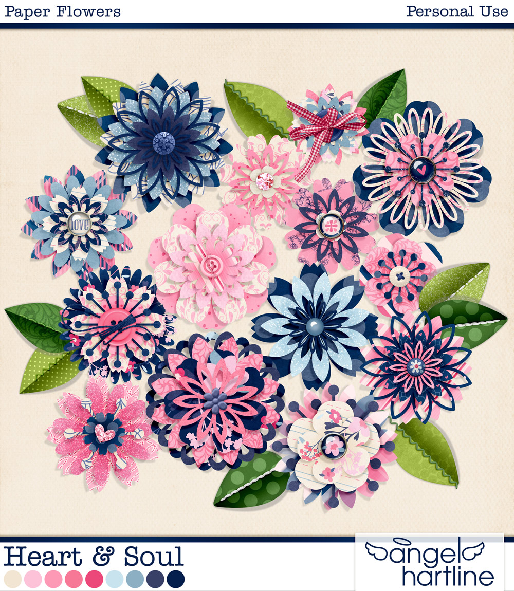 - Heart & Soul: Paper Flowers contains 14 ready to use (shadowed) layered paper flowers & 5 paper leaves. Unshadowed versions also included. Format: PNG