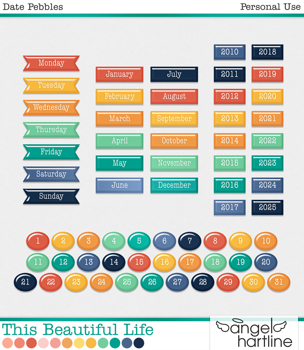 - 66 date pebbles (days of the week, months, days 1-31, years 2010-2025, PNG)