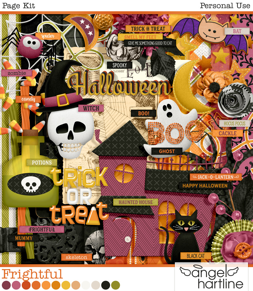 Fall Frolic coordinates with my delightful Halloween collection, Frightful, so you can mix-n-match all packs to create endless layout options. Frightful also includes a lot of unique elements created from my own illustrations. This not-too-spooky gang of friends includes a black cat, spider, ghost, bat, skull & a gaggle of jack-o-lanterns, plus the haunted house they all call home.